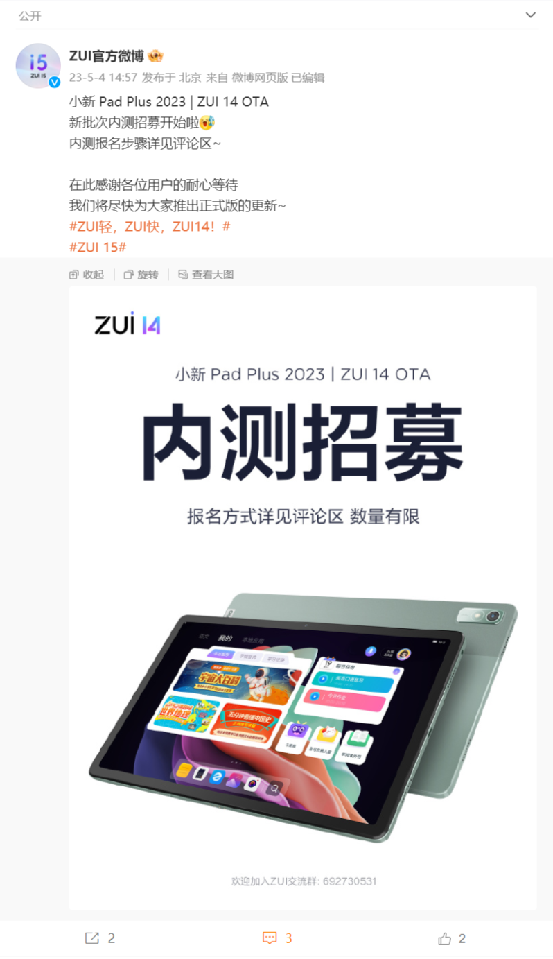 系统之家 5 月 4 日消息,联想小新 Pad Plus 2023 平板电脑开启了 ZUI 14 OTA 内测招募,并且表示将尽快推出 ZUI 14 的正式版更新。联想还公布了内测报名方式:1.私信 ZUI 官方微博。2.关注联想...